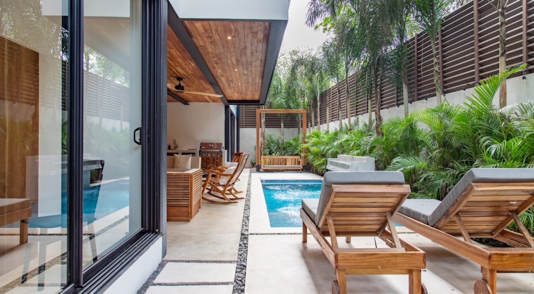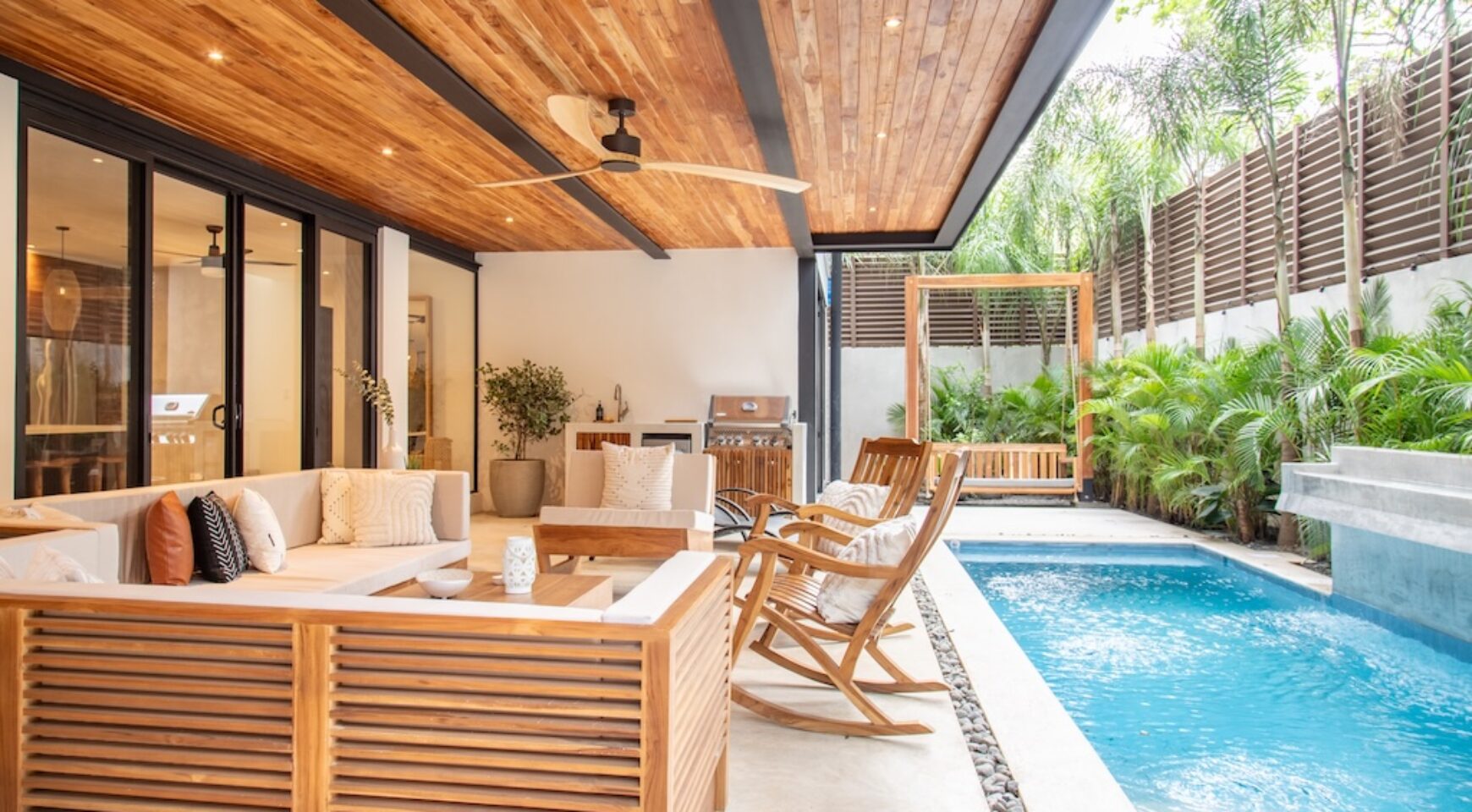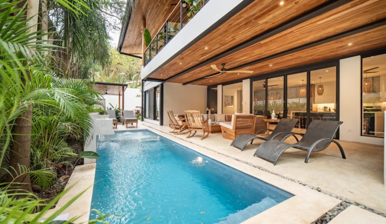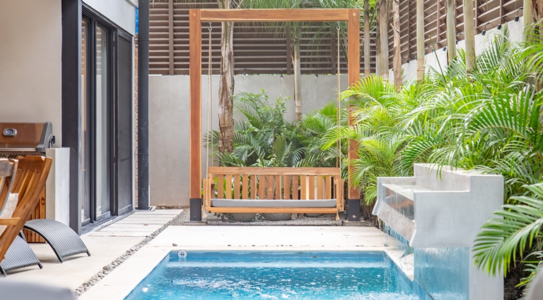 Expansive Private Pool & Gardens: One of the only properties in the neighborhood with a pool, Casa Bergamot features a serene, resort-style pool with a waterfall, two sun decks, lush tropical landscaping, and a custom-designed swing chair. Guests can relax in complete privacy as monkeys swing through the trees and exotic birds fly overhead.