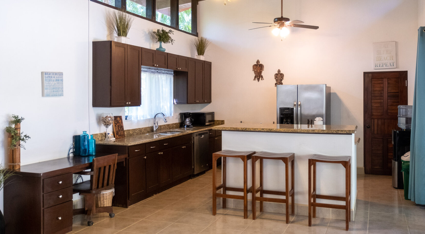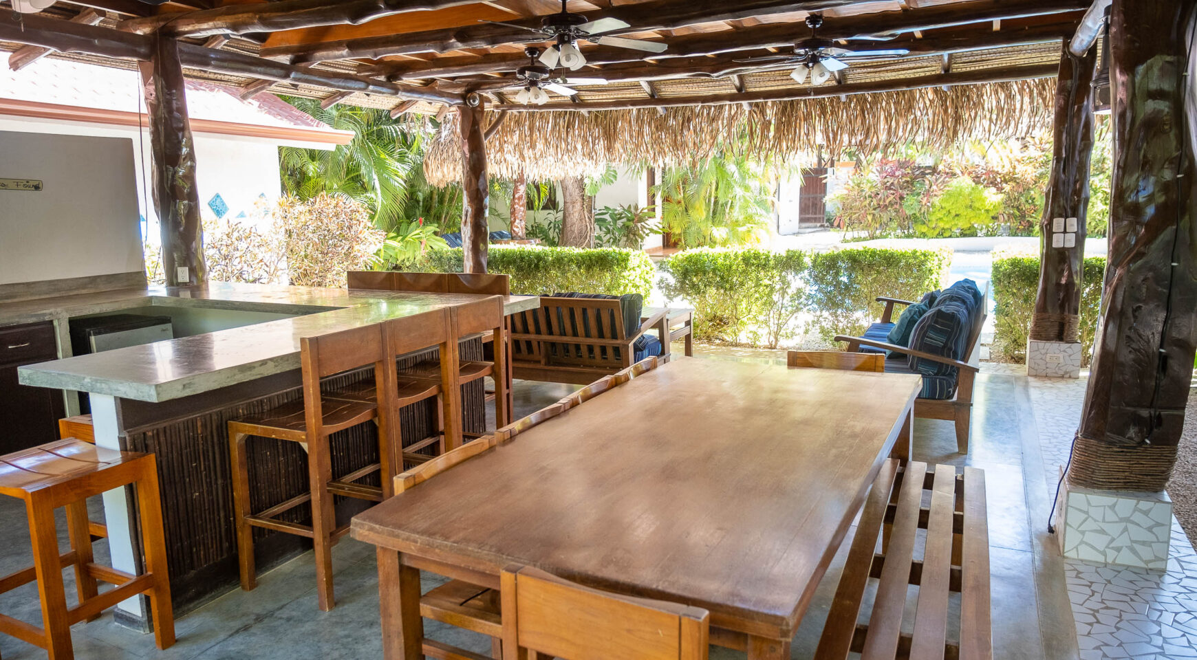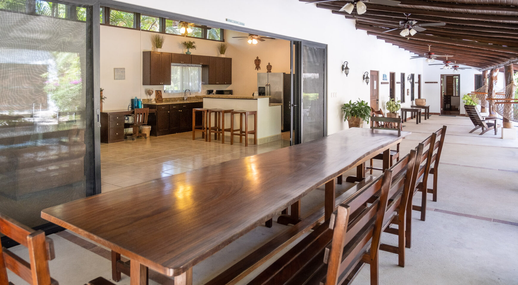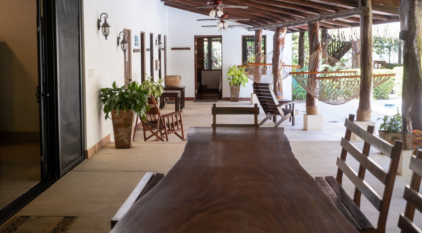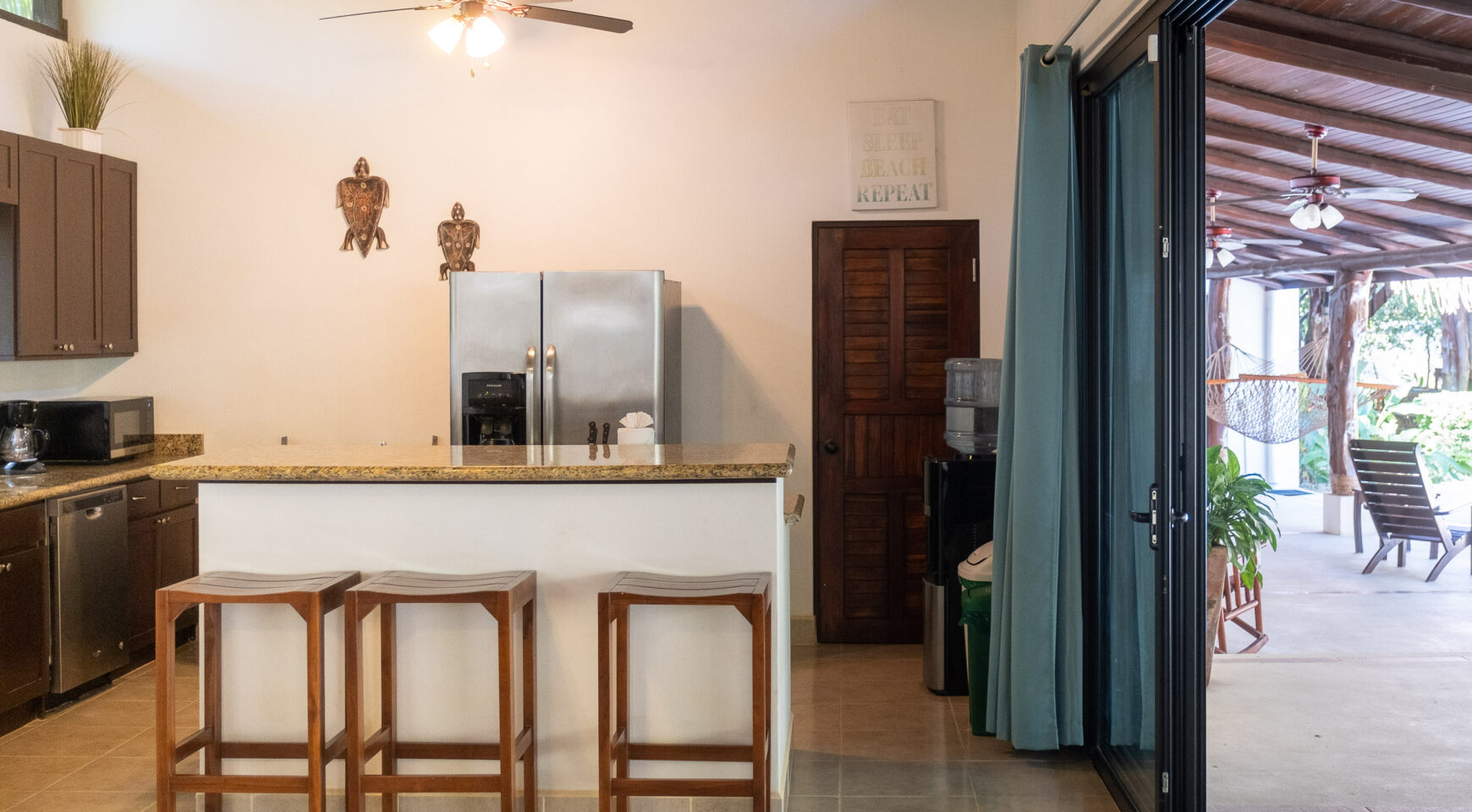 Unwind in one of two hammocks, float in the pool, challenge your friends to a game of ping pong, or drift into a well-deserved nap in the breezy Rancho. Lounge poolside while monkeys swing playfully through the trees above you. Just a short two-minute stroll brings you to a stunning, protected beach—perfect for surfing, long walks, or a morning run. Each bedroom at Casa Cristal de Mar features a private entrance off the patio, offering total privacy for guests. Ideal for four couples or two families traveling together. The property is fully surrounded and beautifully landscaped with lush gardens for maximum privacy. A secure closet and individual mini safes in each bedroom offer added peace of mind.