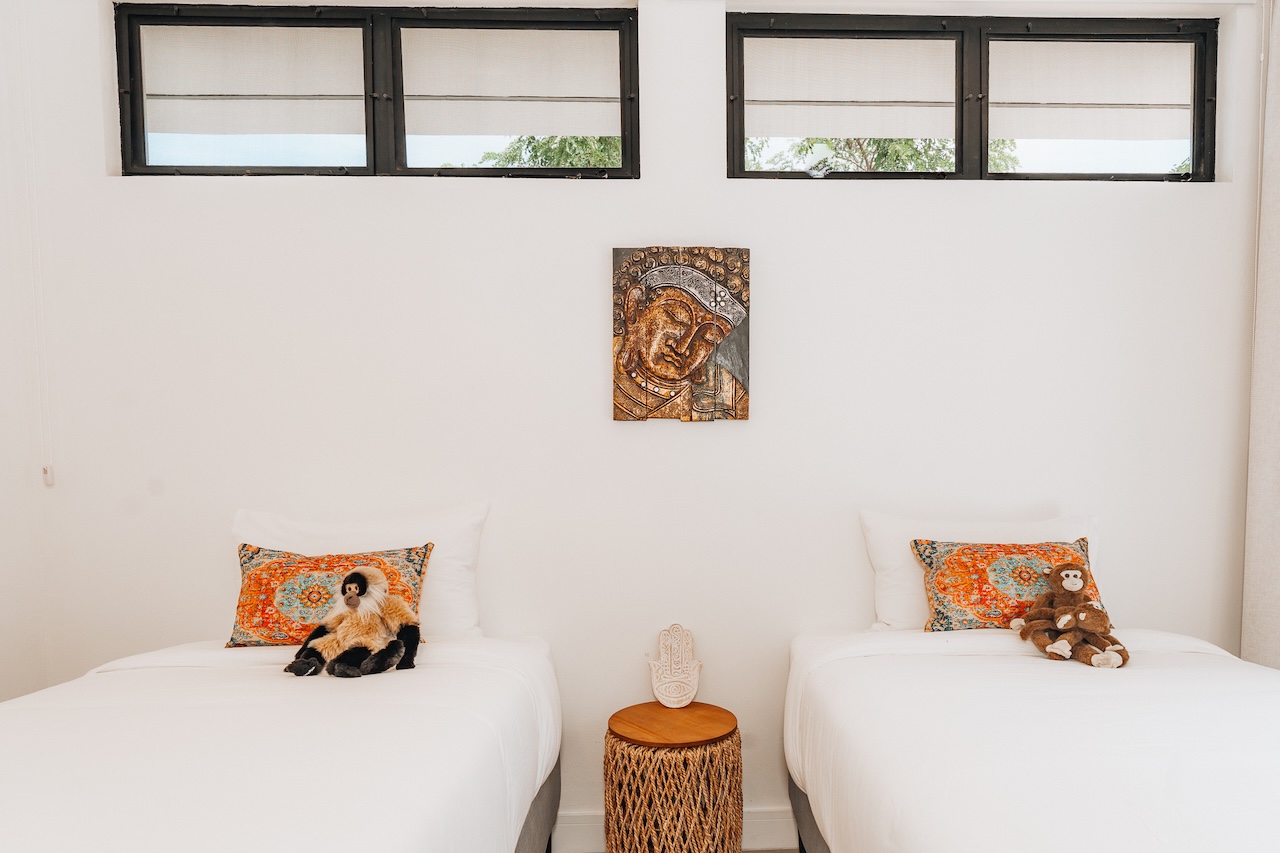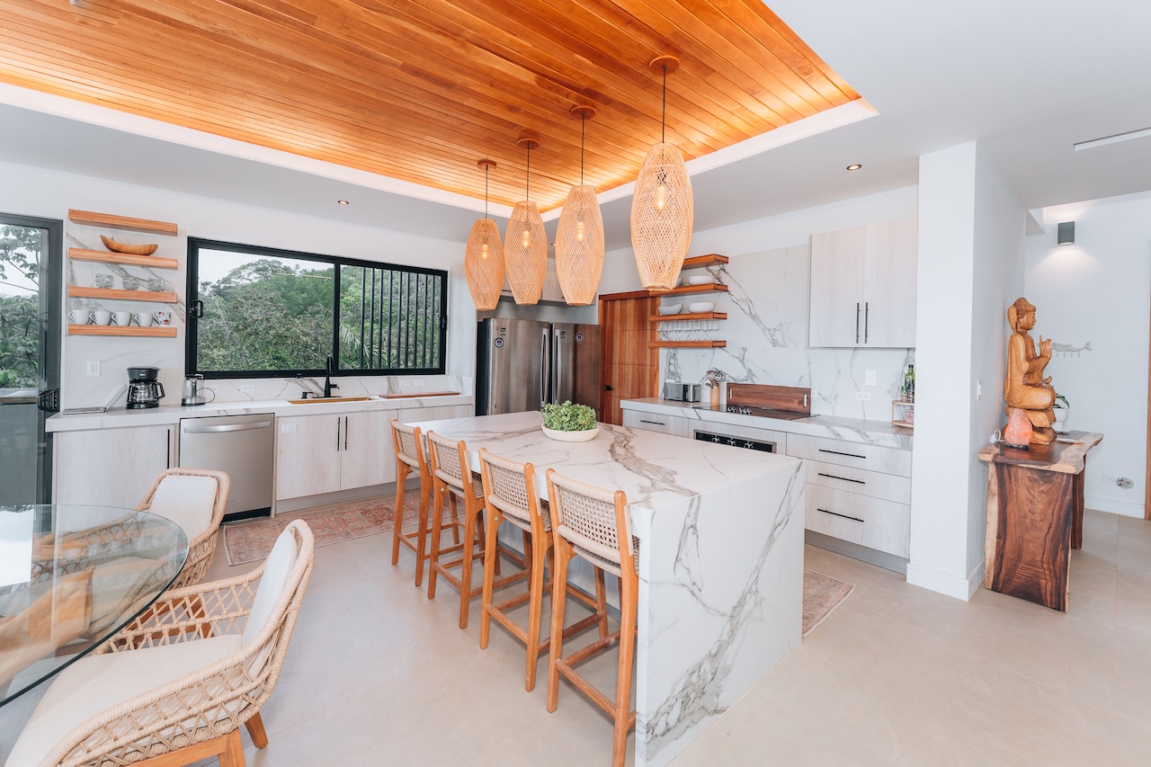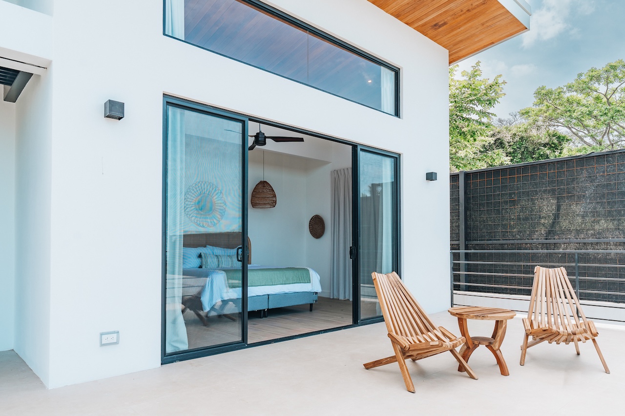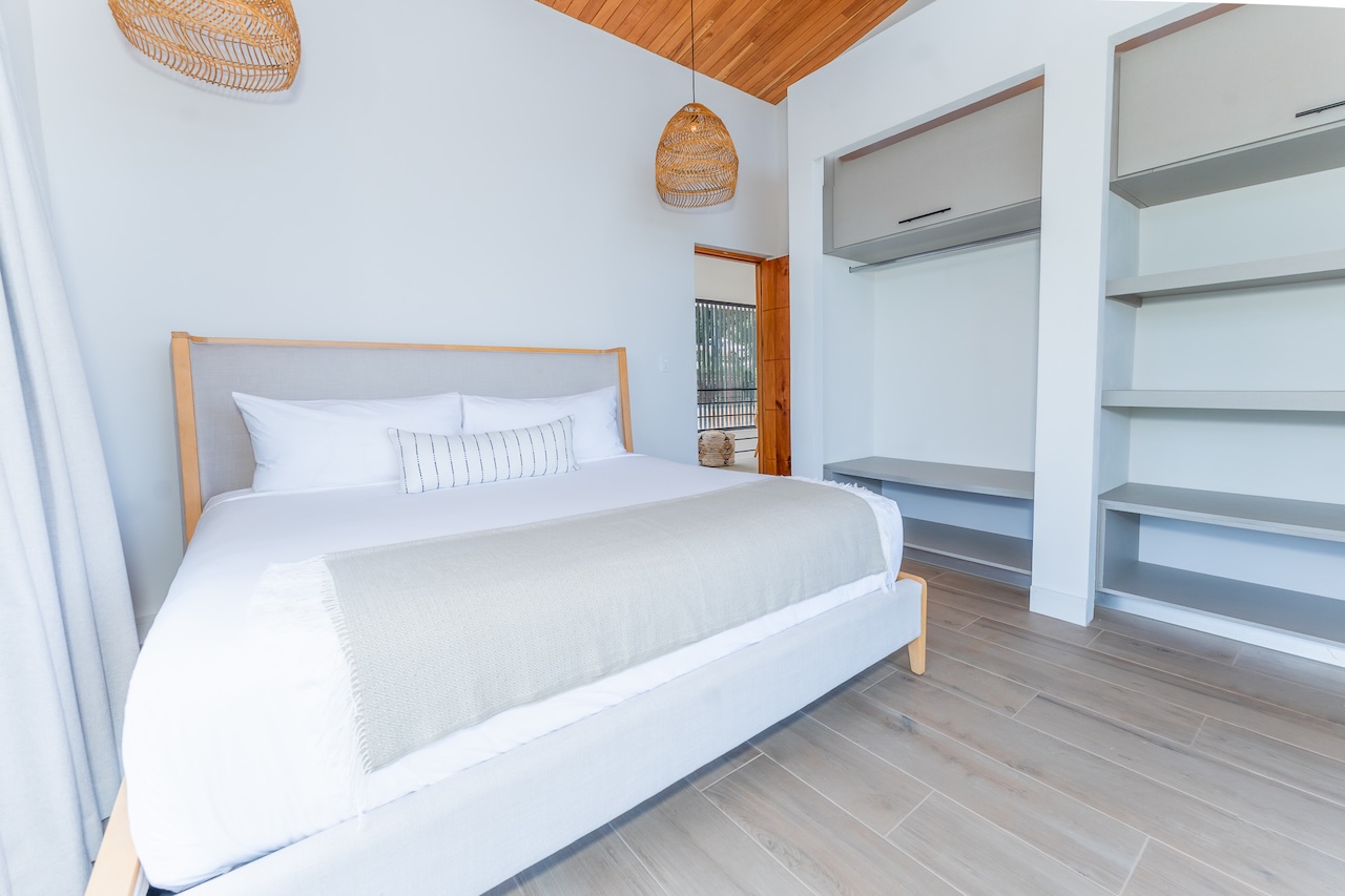 The main house features two master suites, and four of the bedrooms open onto private patios with breathtaking views and the sounds of tropical birds and howler monkeys. The fifth bedroom overlooks the jungle and offers a flexible setup: two twin beds or one king.