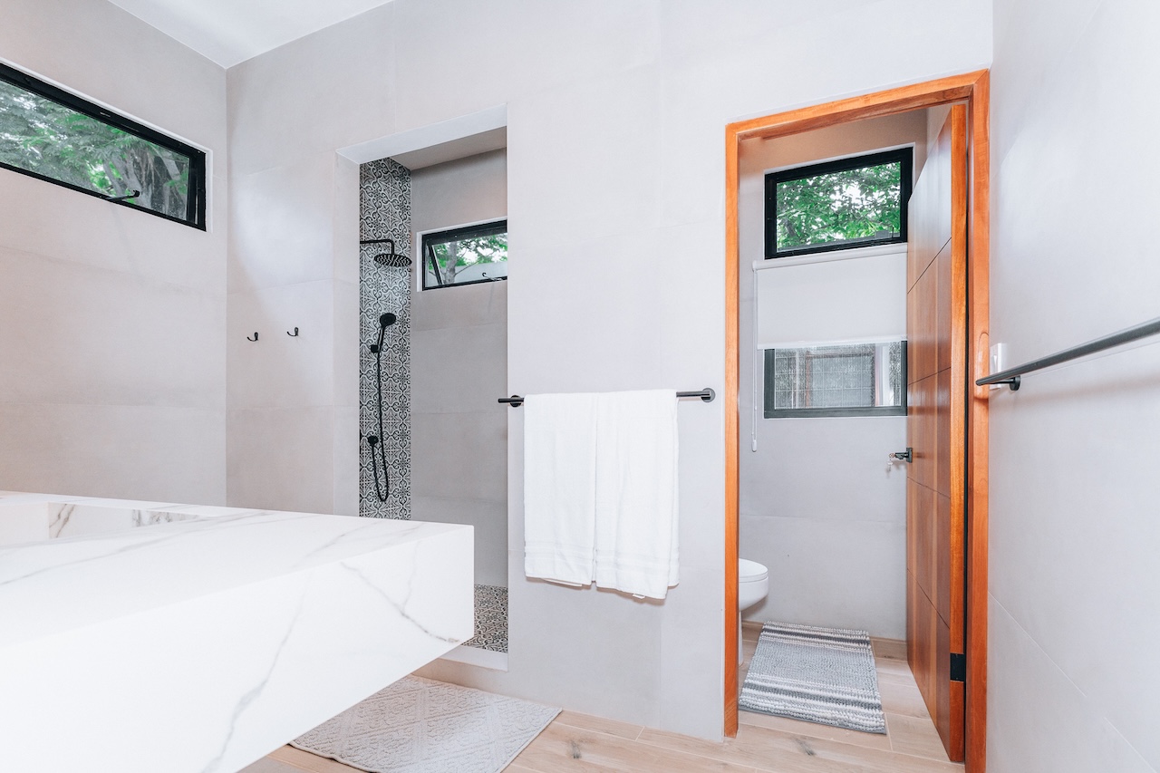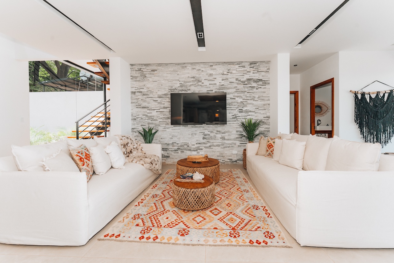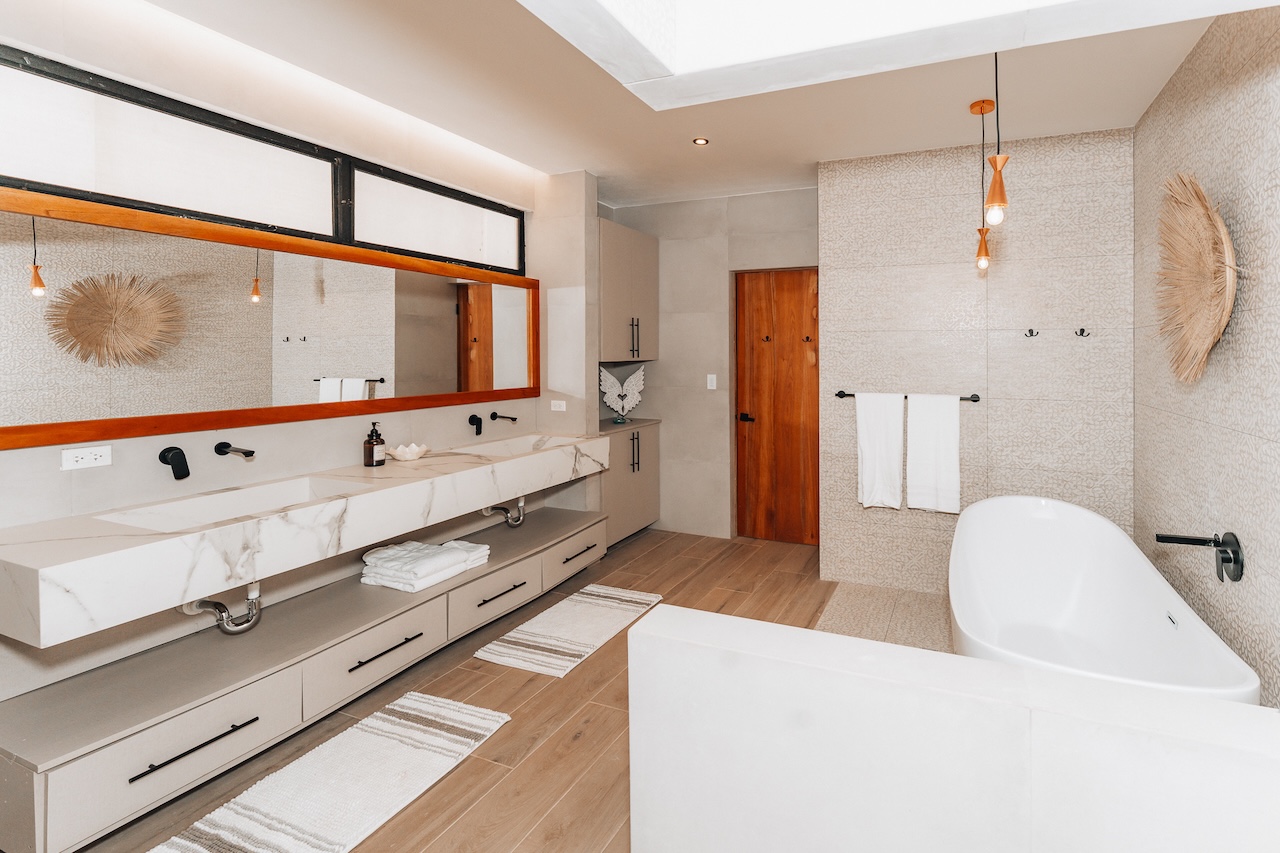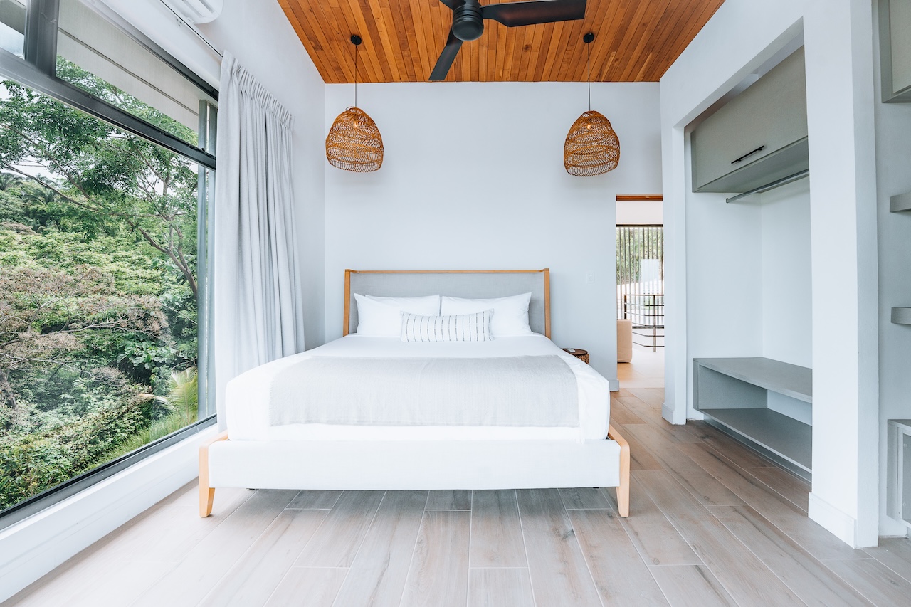 The main house features two master suites, and four of the bedrooms open onto private patios with breathtaking views and the sounds of tropical birds and howler monkeys. The fifth bedroom overlooks the jungle and offers a flexible setup: two twin beds or one king.