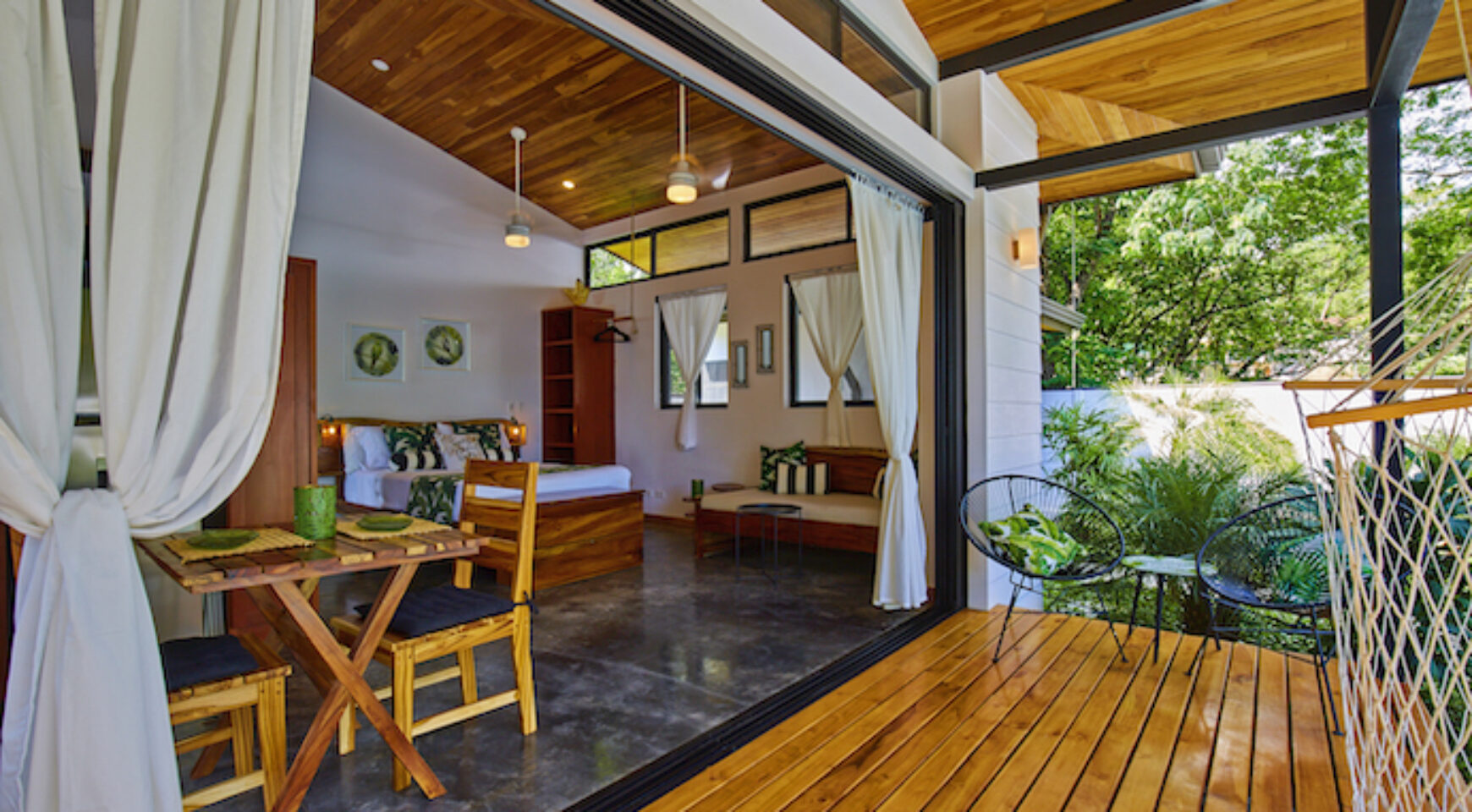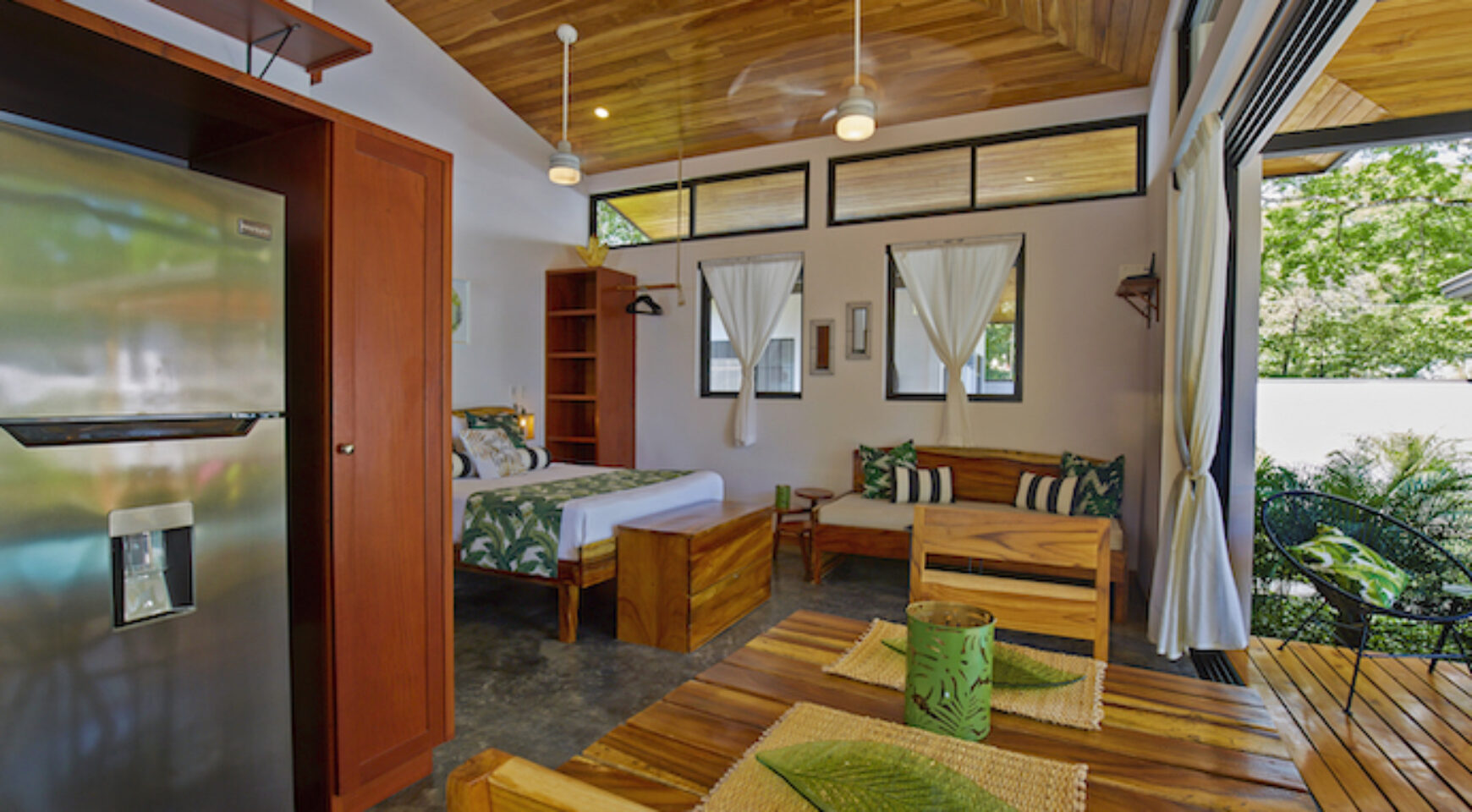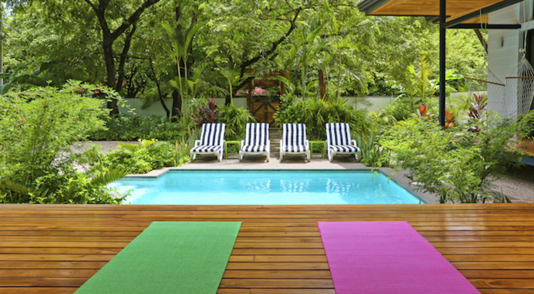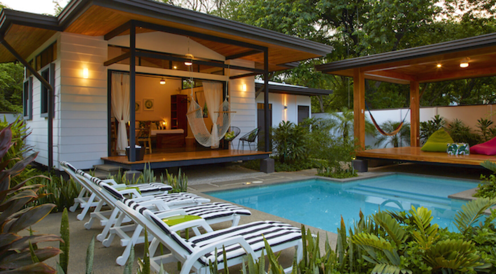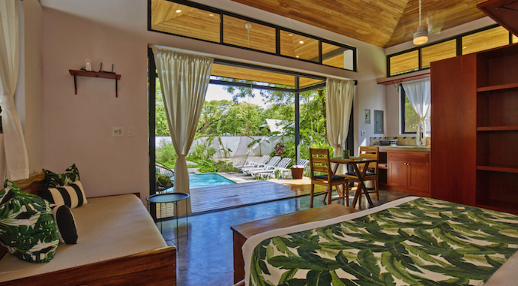 Discover Costa Rica’ Pura Vida lifestyle in the charming brand-new Lily Pad property. We offer two independent bungalow style studios with covered outdoor patio overlooking the swimming pool and yoga deck. Our lush property Lily Pad Nosara is conveniently located just a short walk from the beach, local restaurants and surf.