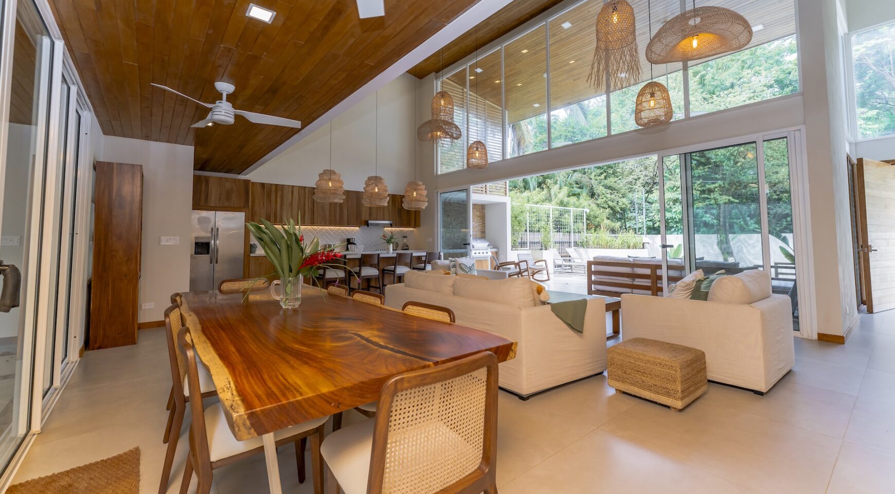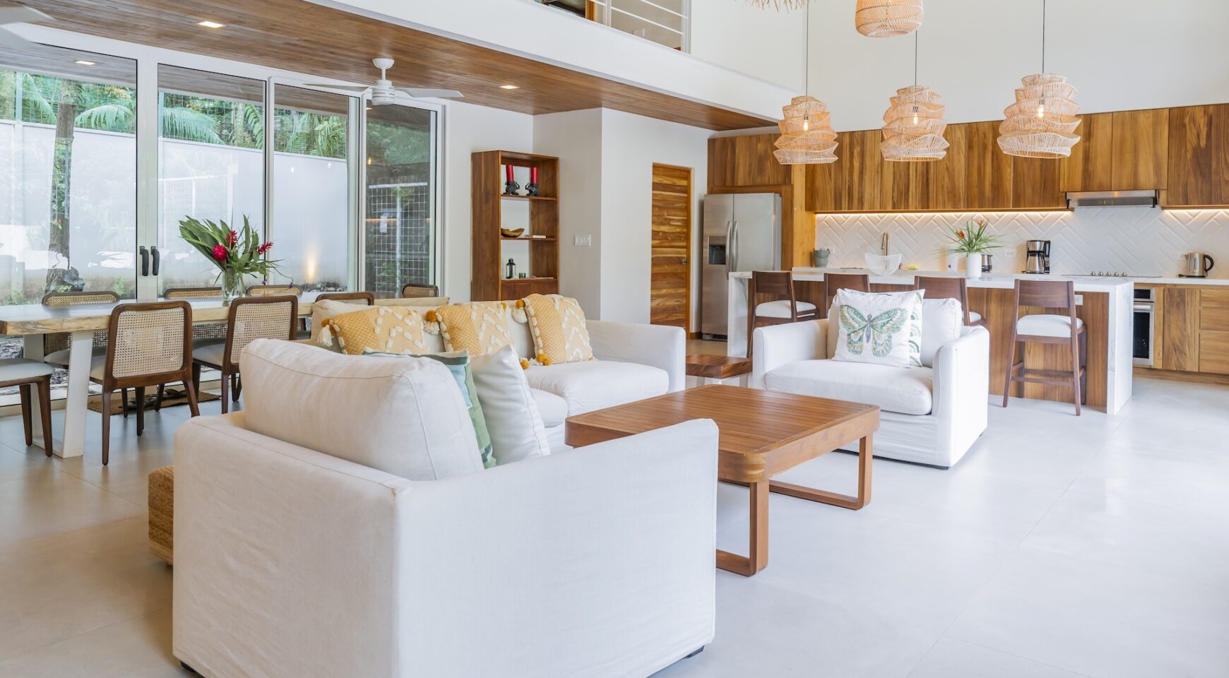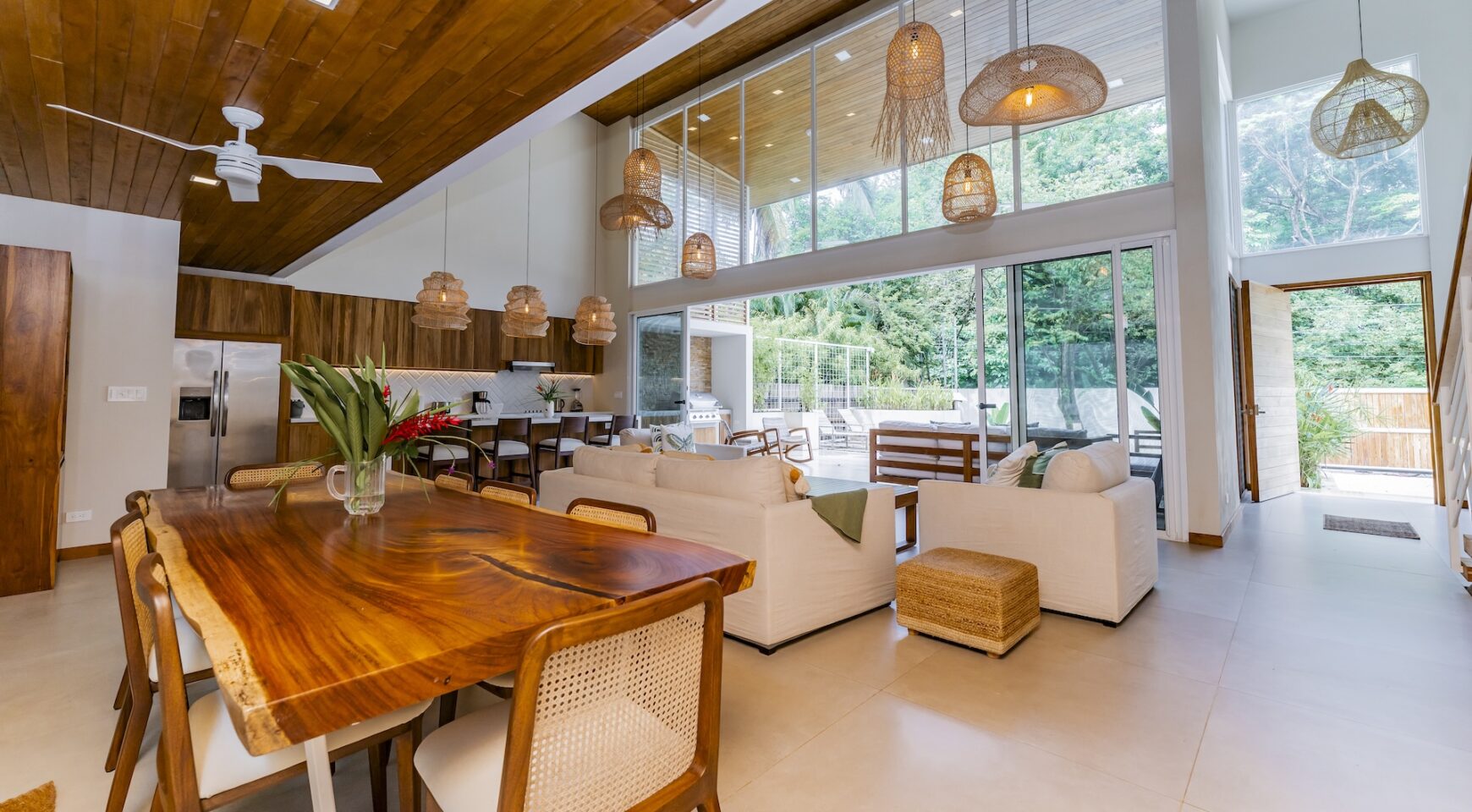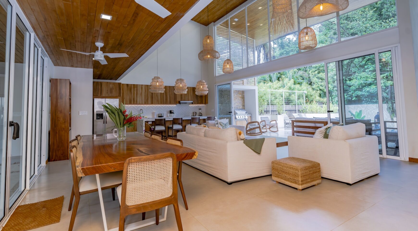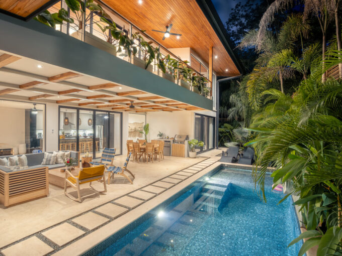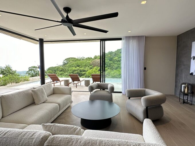 Step inside an open-concept living area, where natural light floods through large windows, creating a bright and inviting atmosphere. The fully equipped kitchen boasts high-end appliances and a generous island, perfect for delicious meals. Relax in the stylish living room, with comfortable seating and a view of the pool and the surrounding jungle.
