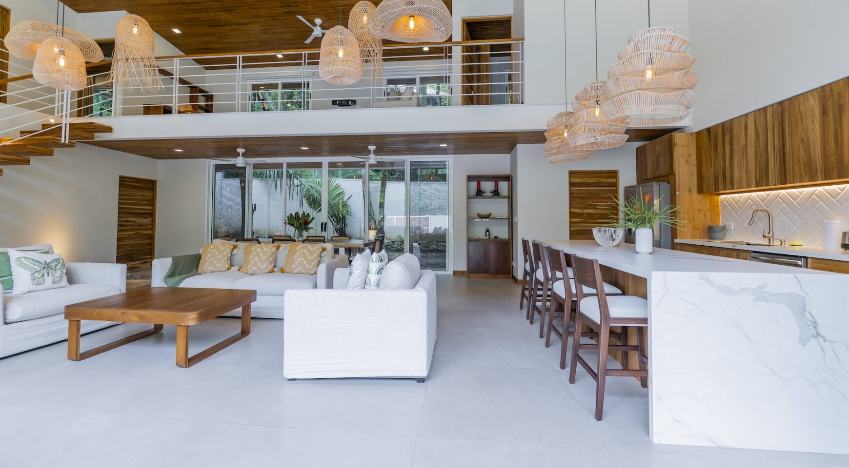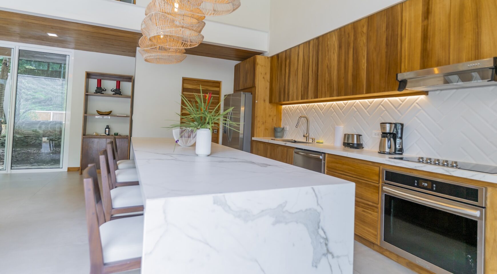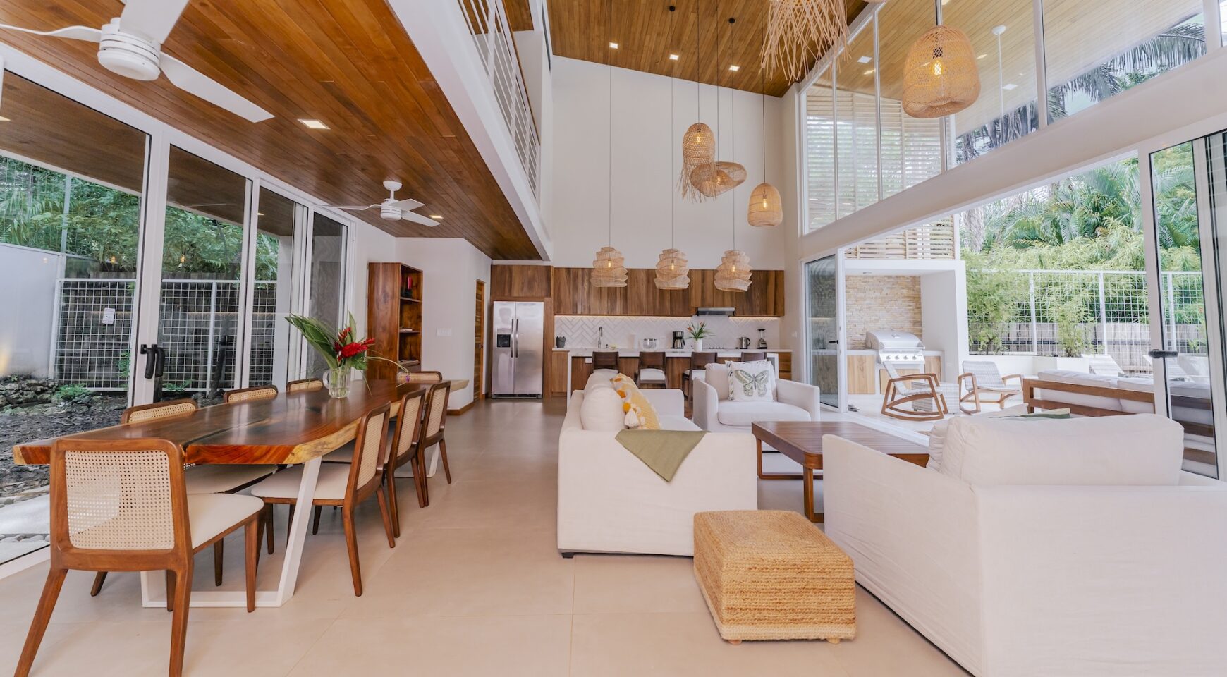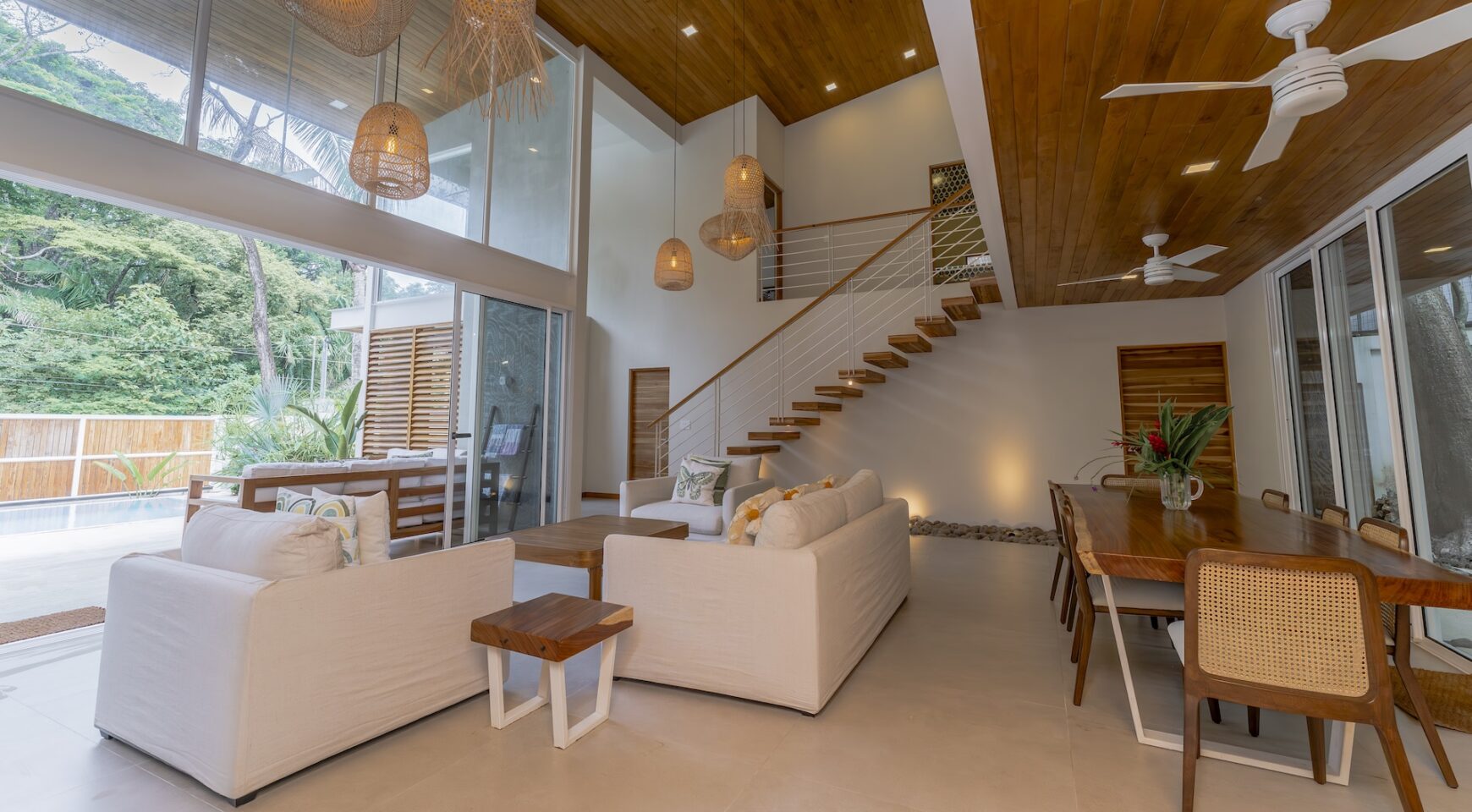 Step inside an open-concept living area, where natural light floods through large windows, creating a bright and inviting atmosphere. The fully equipped kitchen boasts high-end appliances and a generous island, perfect for delicious meals. Relax in the stylish living room, with comfortable seating and a view of the pool and the surrounding jungle.