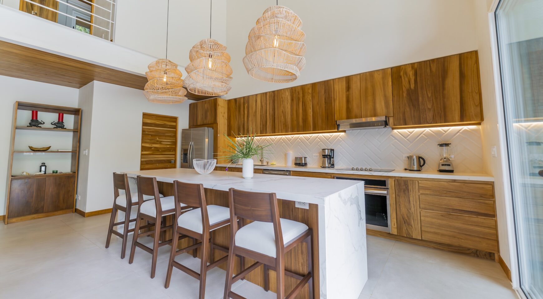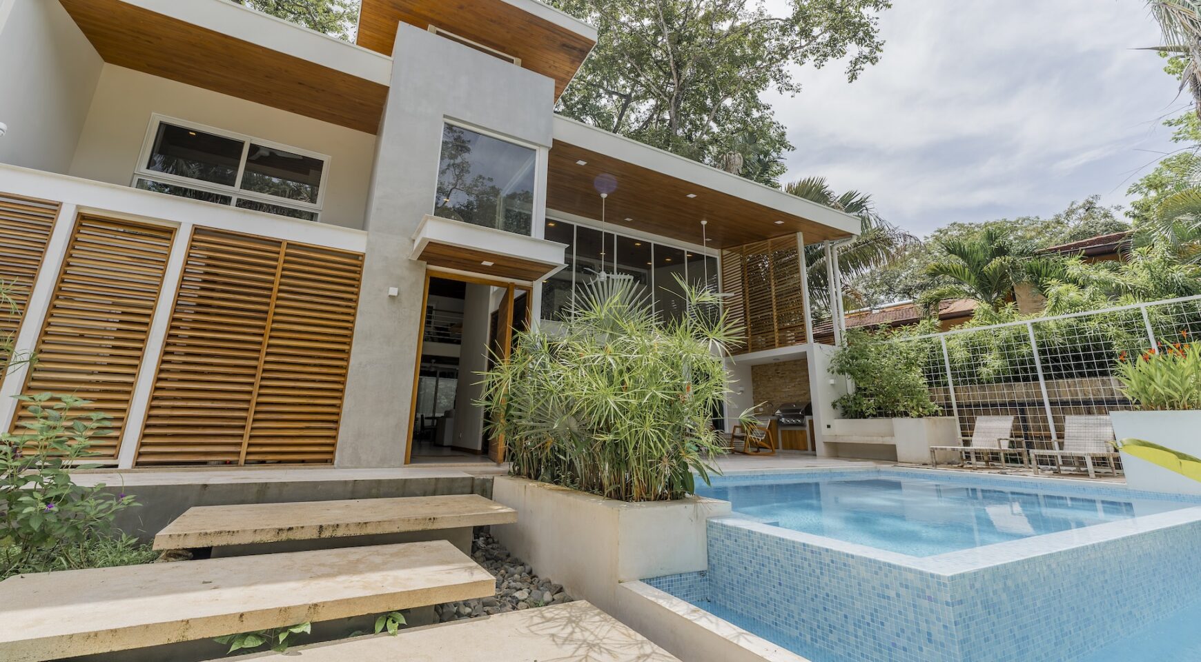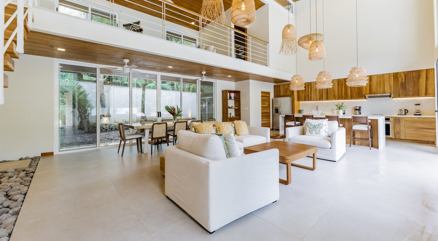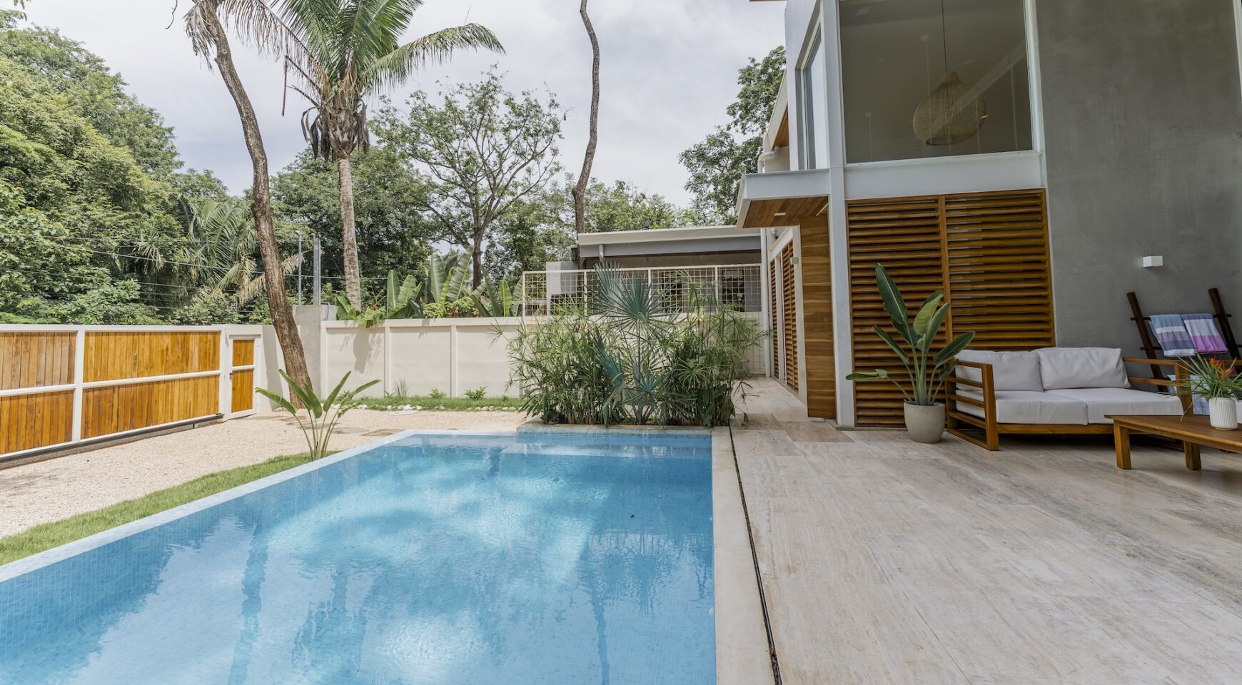 Step inside an open-concept living area, where natural light floods through large windows, creating a bright and inviting atmosphere. The fully equipped kitchen boasts high-end appliances and a generous island, perfect for delicious meals. Relax in the stylish living room, with comfortable seating and a view of the pool and the surrounding jungle.