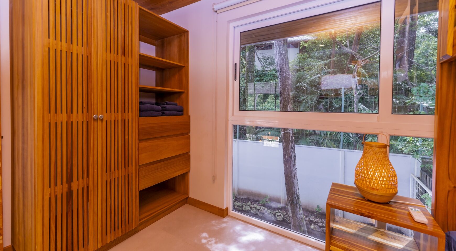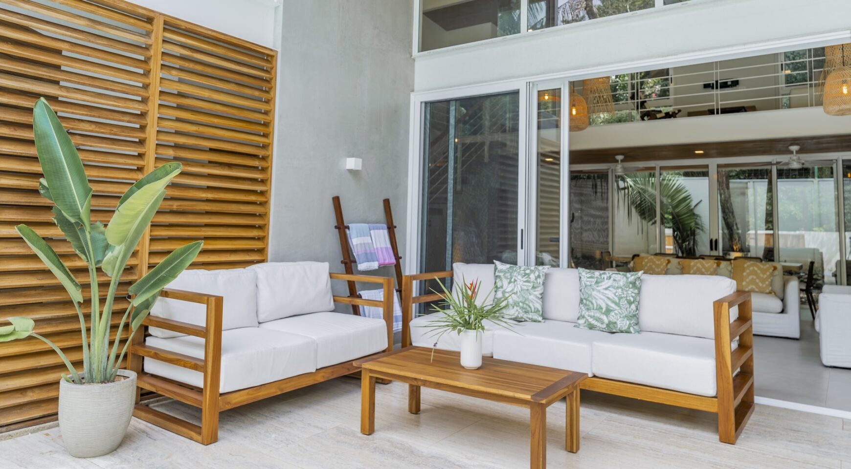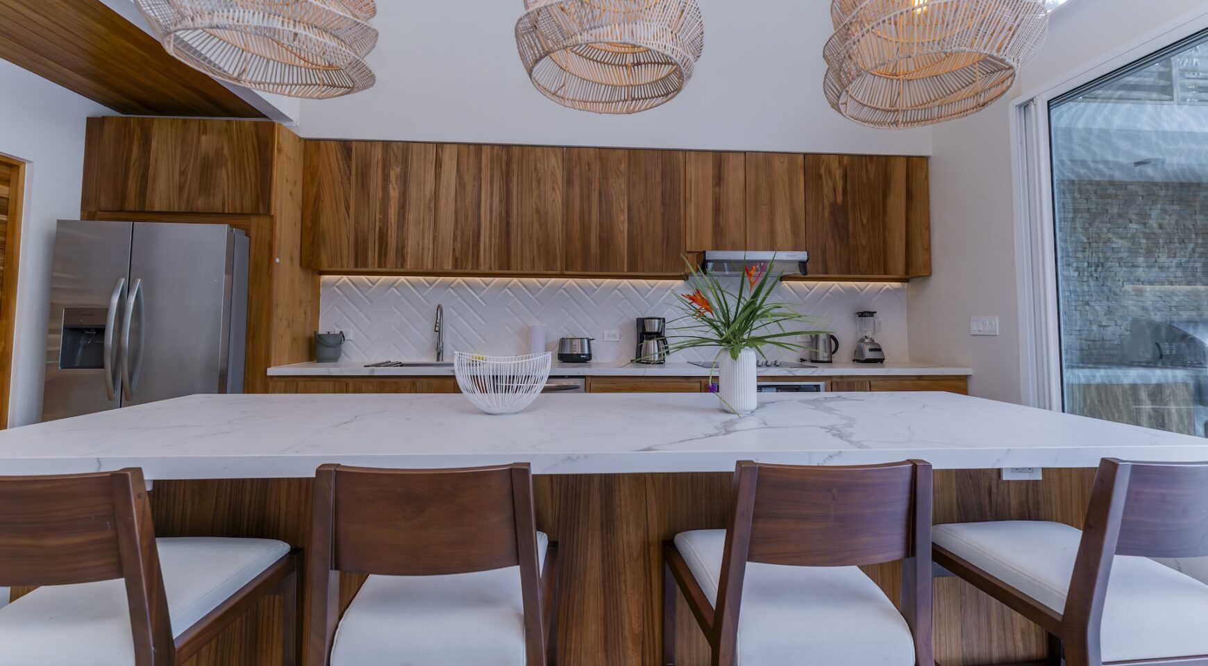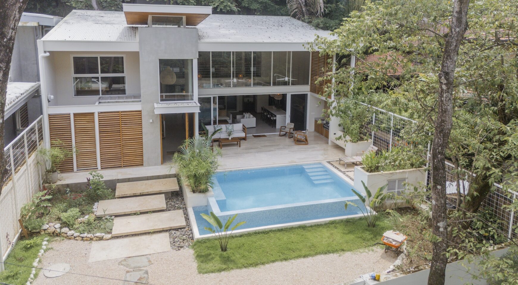 Step inside an open-concept living area, where natural light floods through large windows, creating a bright and inviting atmosphere. The fully equipped kitchen boasts high-end appliances and a generous island, perfect for delicious meals. Relax in the stylish living room, with comfortable seating and a view of the pool and the surrounding jungle.