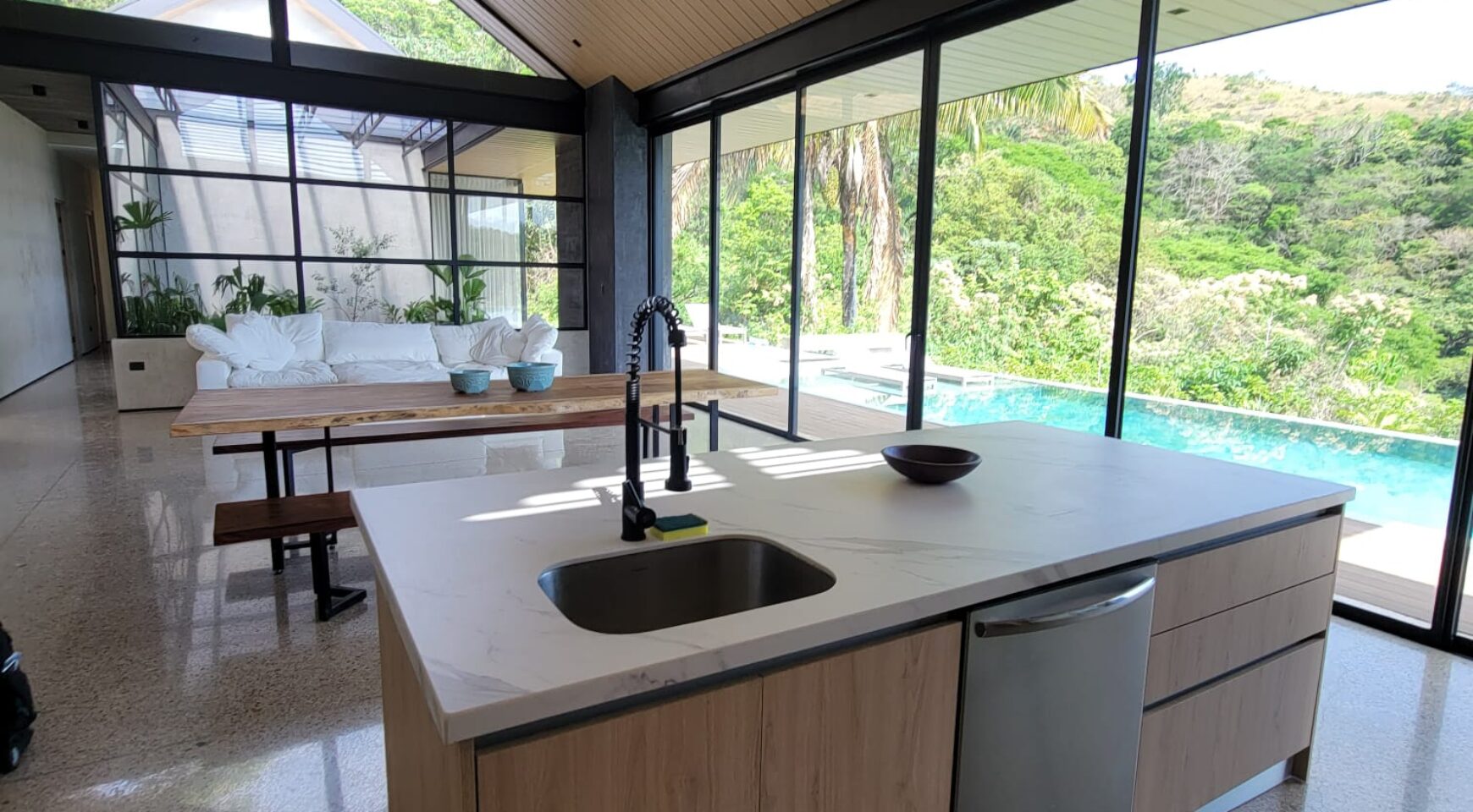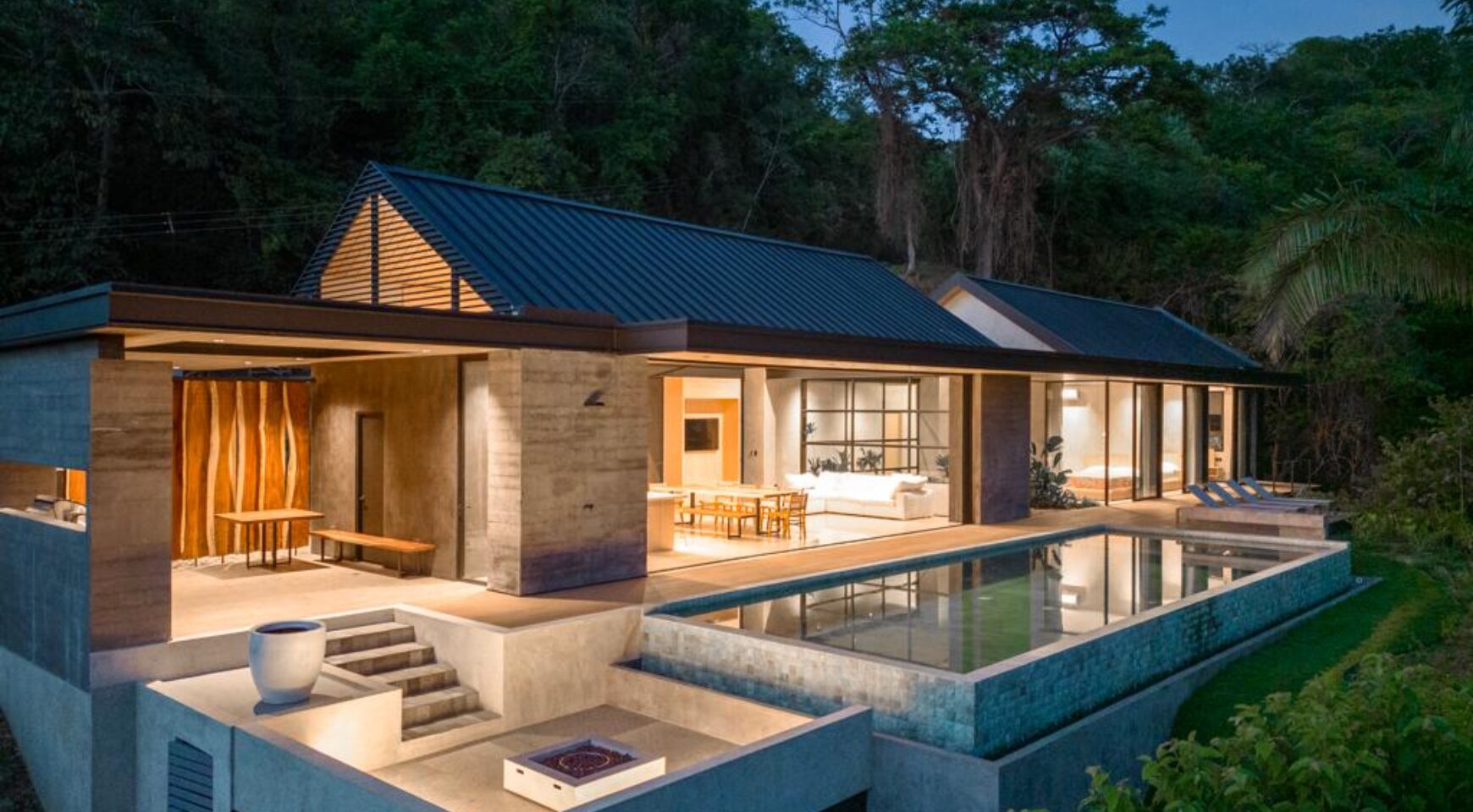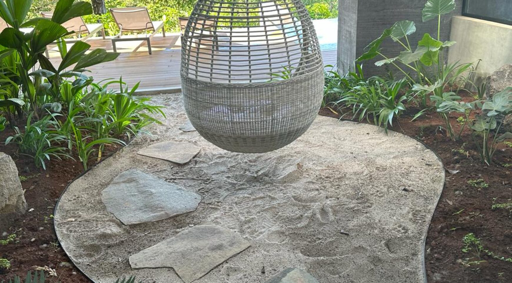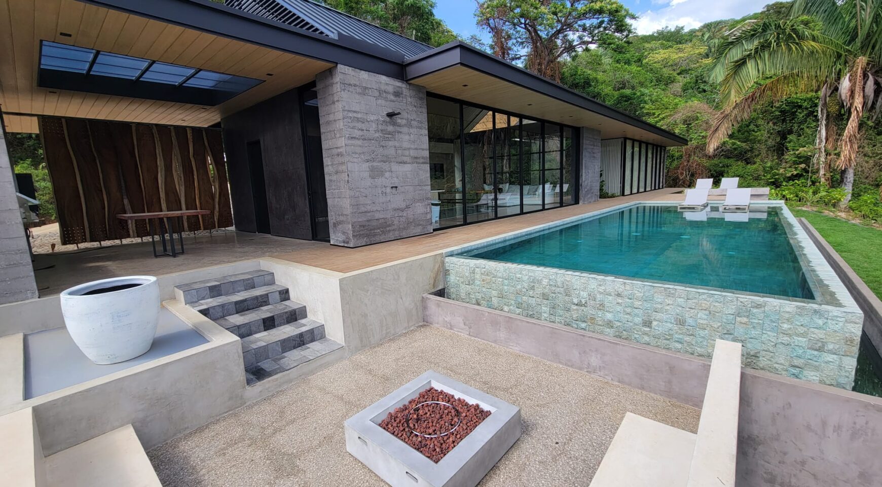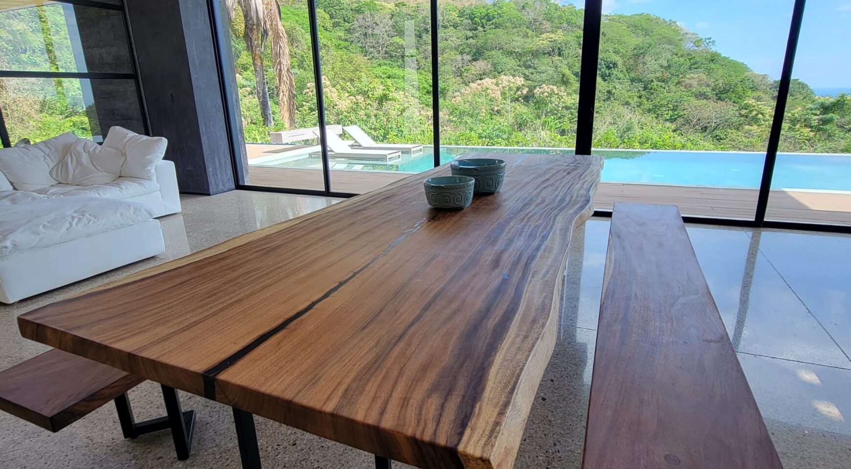 We are so excited to share this GORGEOUS brand-new home, designed and built by Architect, Mario Vargas. Created to blend nature and beauty with stunning views of the Cerro Valley and Pacific Ocean from all the rooms. The entire front of the house is glass and opens to a 30′ infinity pool, outdoor showers, and inset firepit area. The beautiful exterior gardens invite guests to be part of nature as they relax in luxury. Enjoy the interior garden courtyard while you swing in the hanging wicker chair and feel the gentle breezes or relax in the sun loungers on the pool deck.