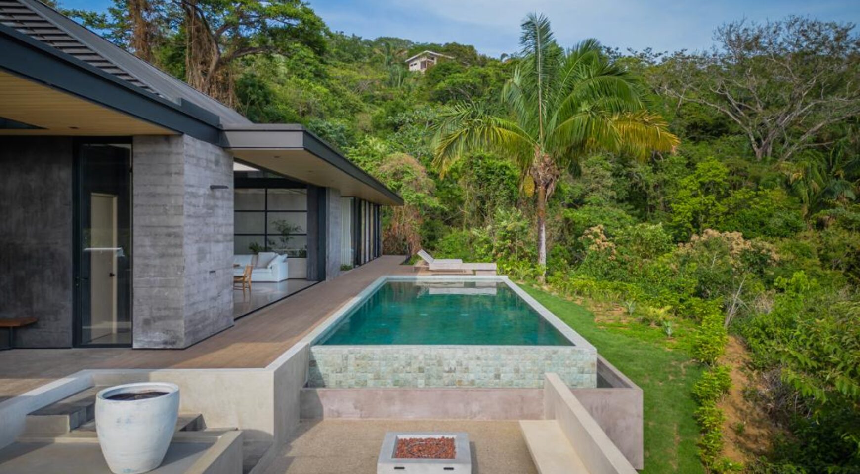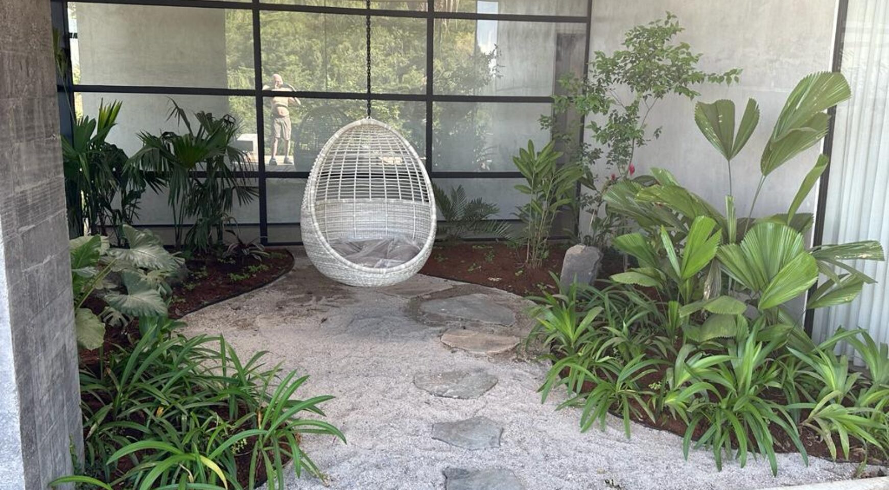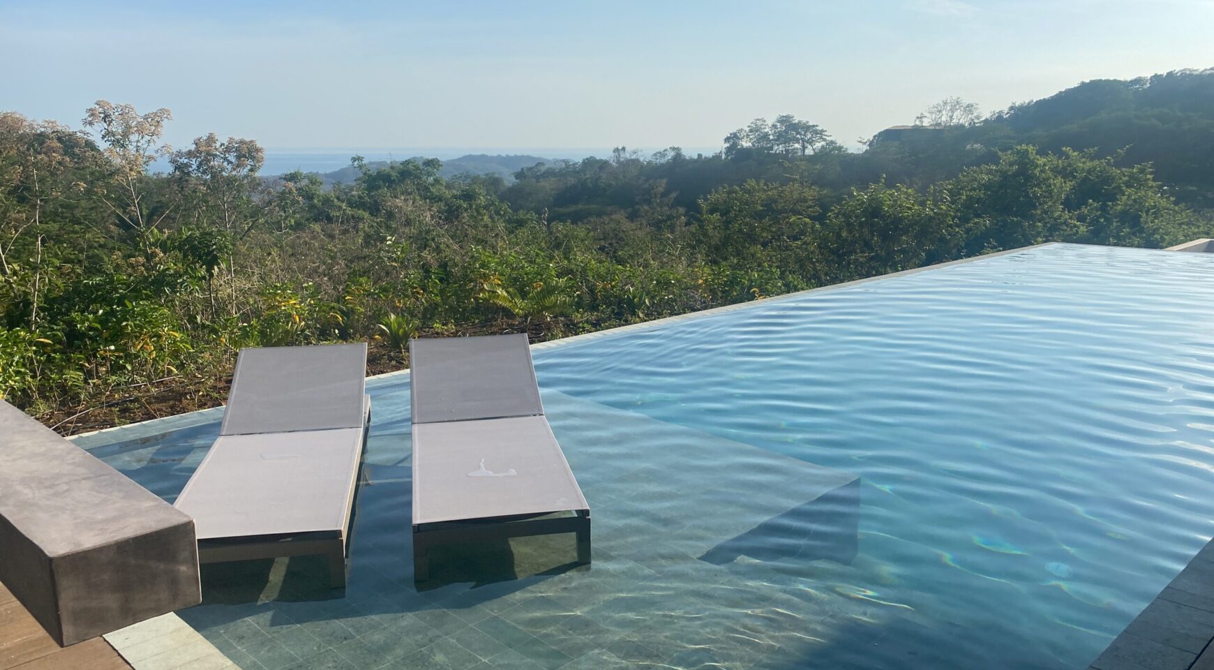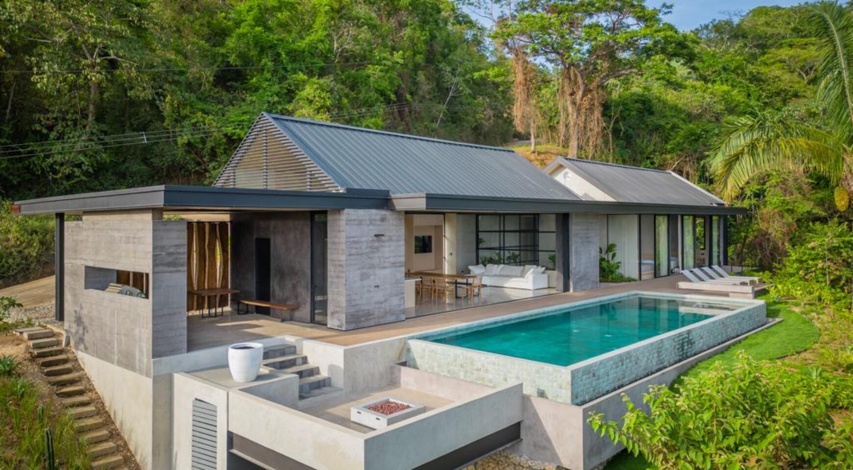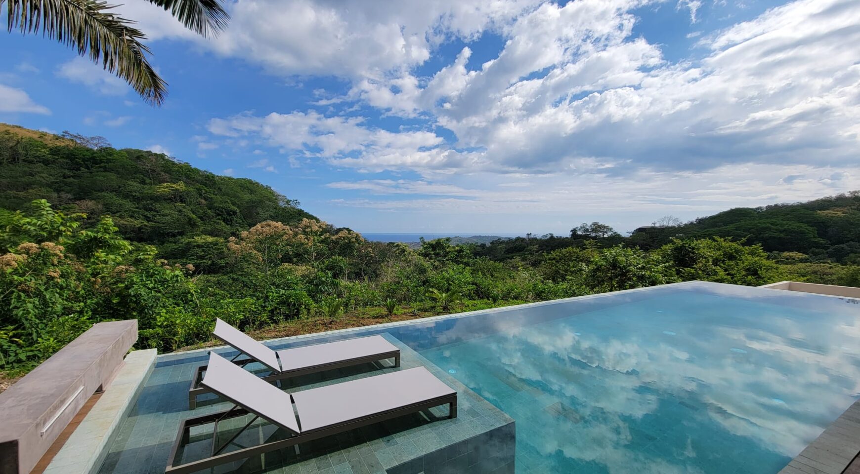 We are so excited to share this GORGEOUS brand-new home, designed and built by Architect, Mario Vargas. Created to blend nature and beauty with stunning views of the Cerro Valley and Pacific Ocean from all the rooms. The entire front of the house is glass and opens to a 30′ infinity pool, outdoor showers, and inset firepit area. The beautiful exterior gardens invite guests to be part of nature as they relax in luxury. Enjoy the interior garden courtyard while you swing in the hanging wicker chair and feel the gentle breezes or relax in the sun loungers on the pool deck.