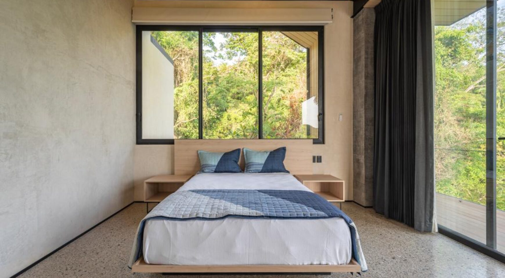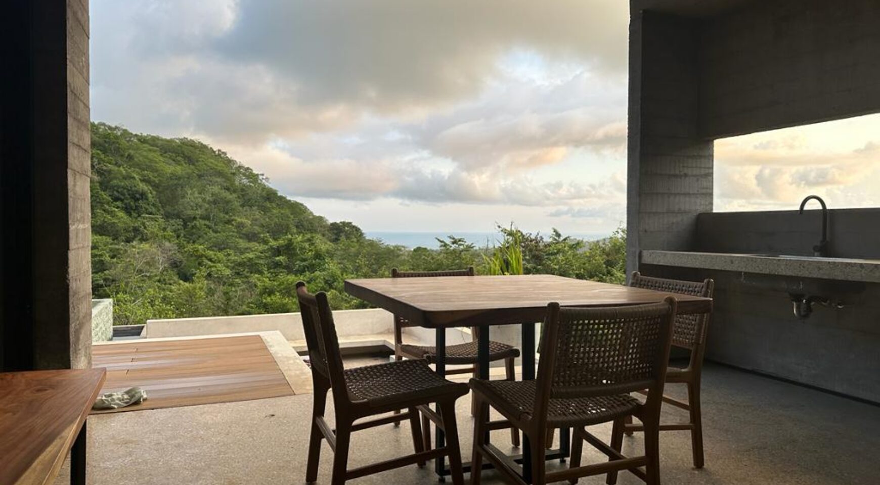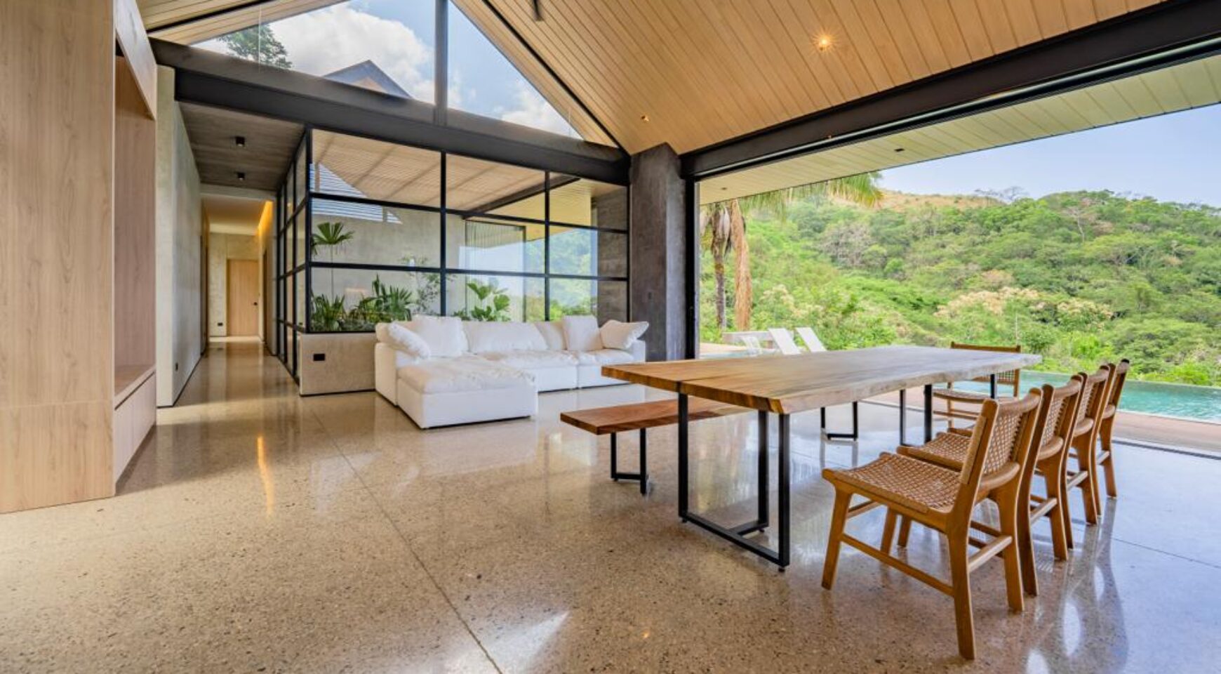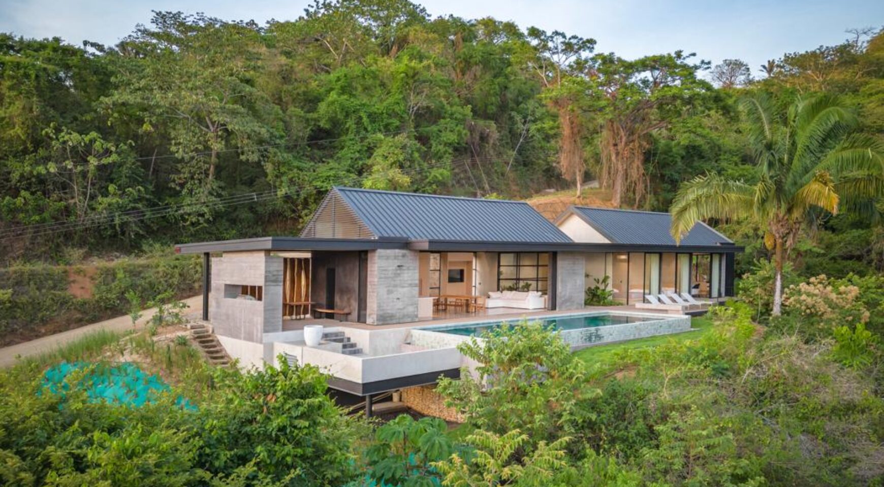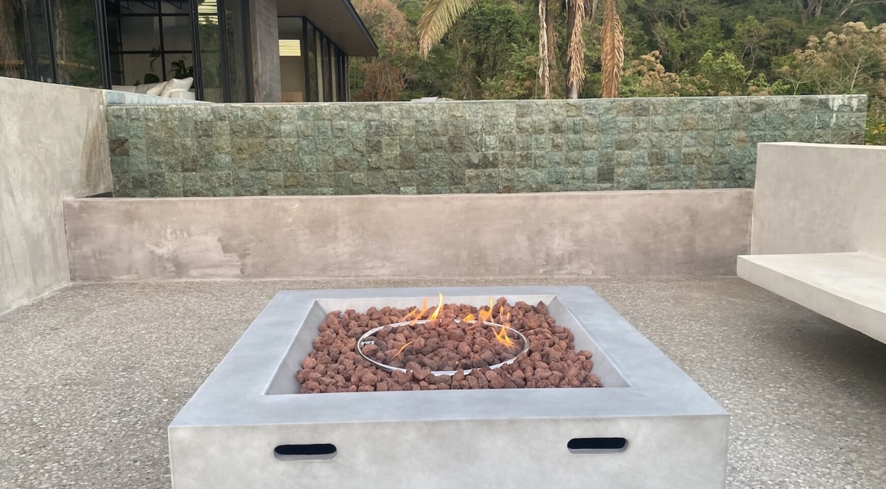 We are so excited to share this GORGEOUS brand-new home, designed and built by Architect, Mario Vargas. Created to blend nature and beauty with stunning views of the Cerro Valley and Pacific Ocean from all the rooms. The entire front of the house is glass and opens to a 30′ infinity pool, outdoor showers, and inset firepit area. The beautiful exterior gardens invite guests to be part of nature as they relax in luxury. Enjoy the interior garden courtyard while you swing in the hanging wicker chair and feel the gentle breezes or relax in the sun loungers on the pool deck.