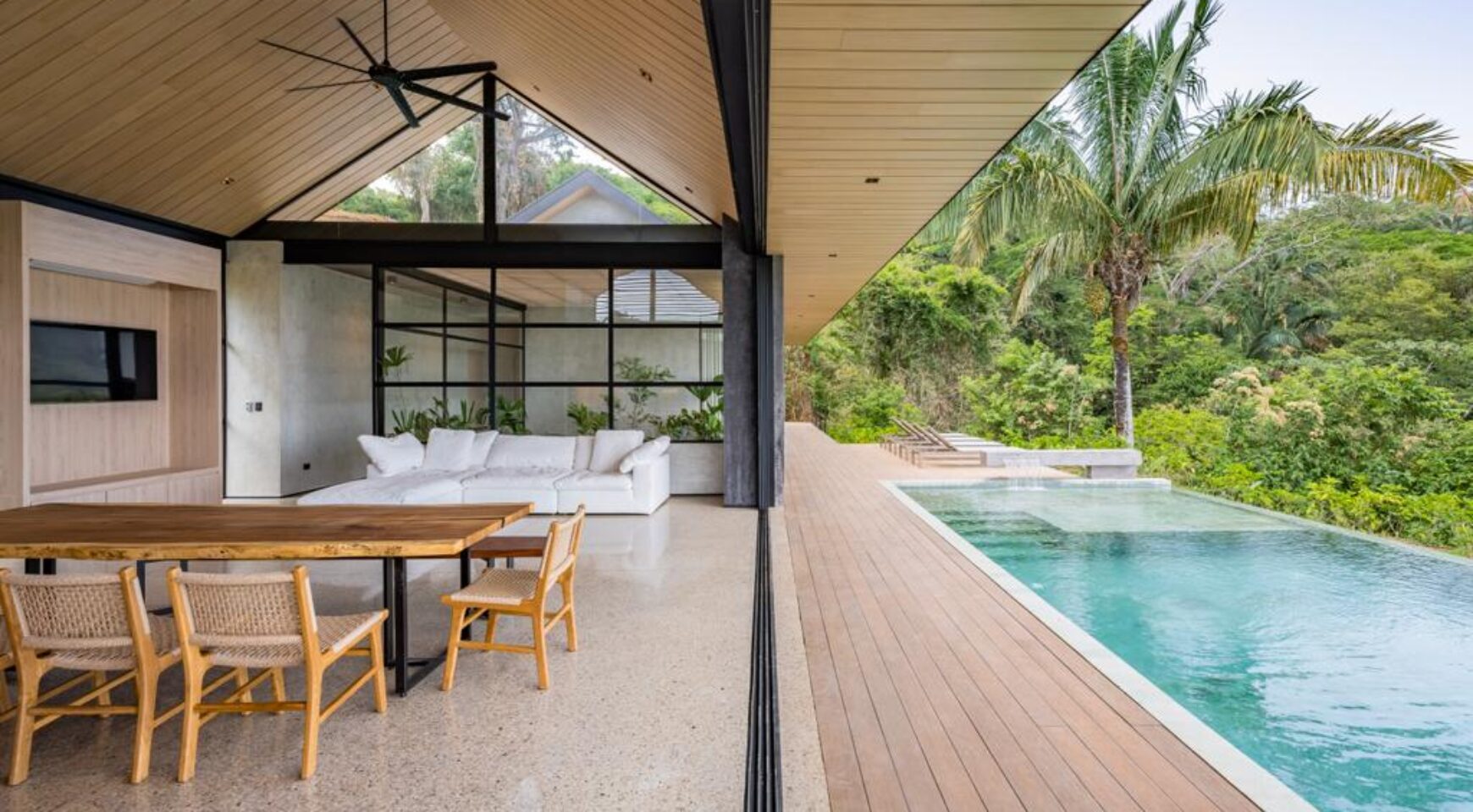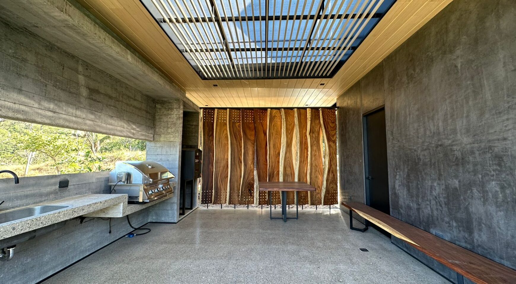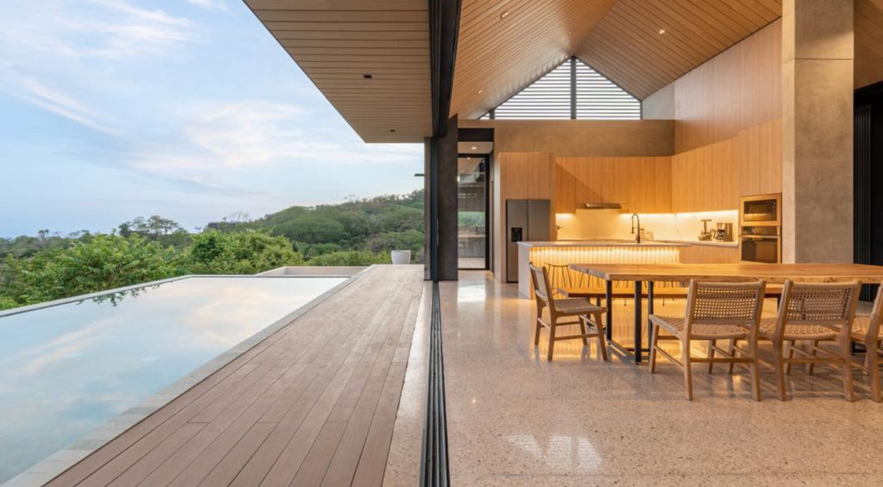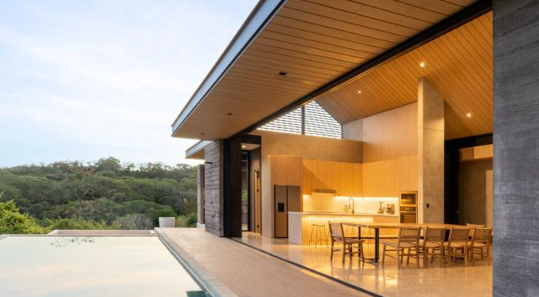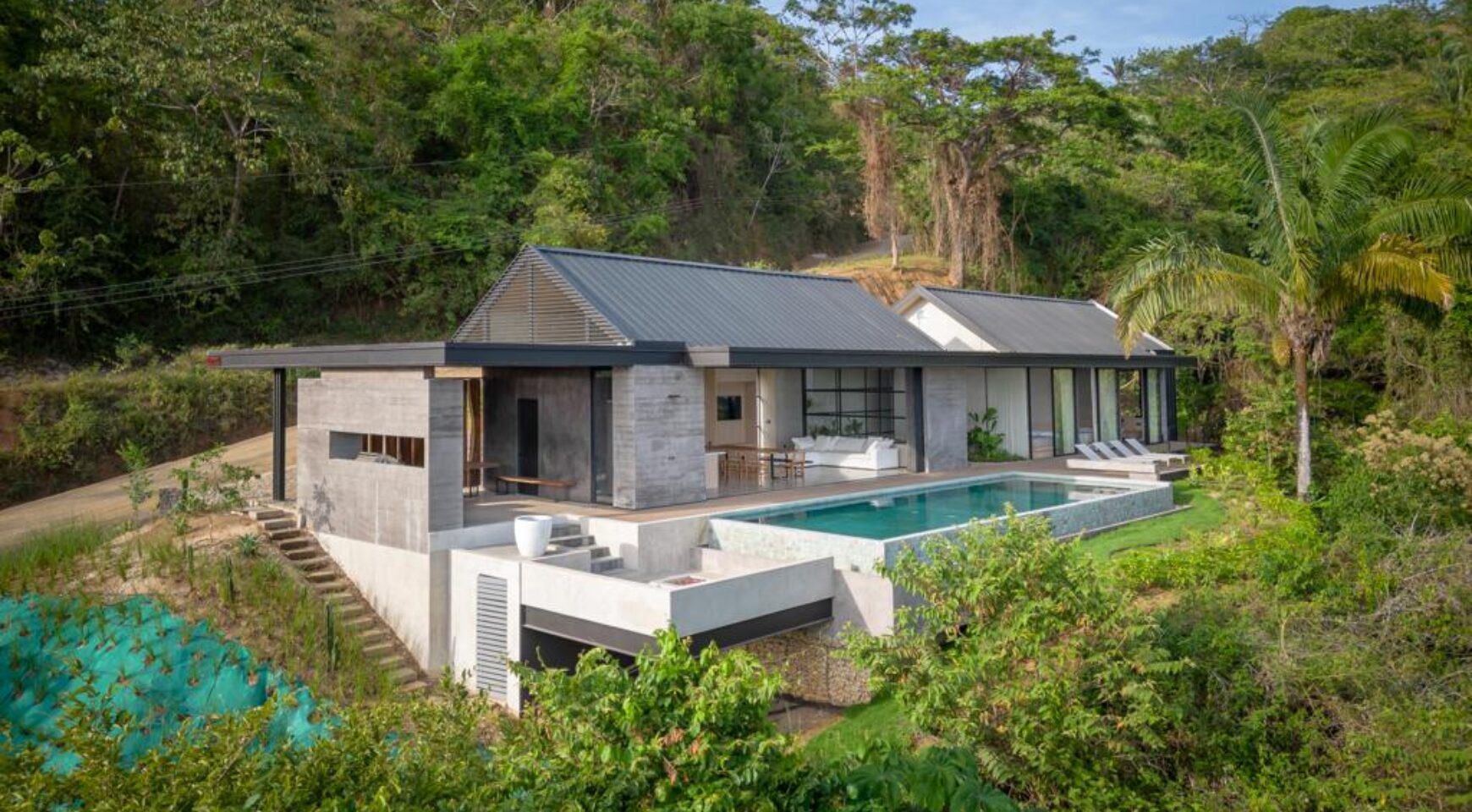 We are so excited to share this GORGEOUS brand-new home, designed and built by Architect, Mario Vargas. Created to blend nature and beauty with stunning views of the Cerro Valley and Pacific Ocean from all the rooms. The entire front of the house is glass and opens to a 30′ infinity pool, outdoor showers, and inset firepit area. The beautiful exterior gardens invite guests to be part of nature as they relax in luxury. Enjoy the interior garden courtyard while you swing in the hanging wicker chair and feel the gentle breezes or relax in the sun loungers on the pool deck.